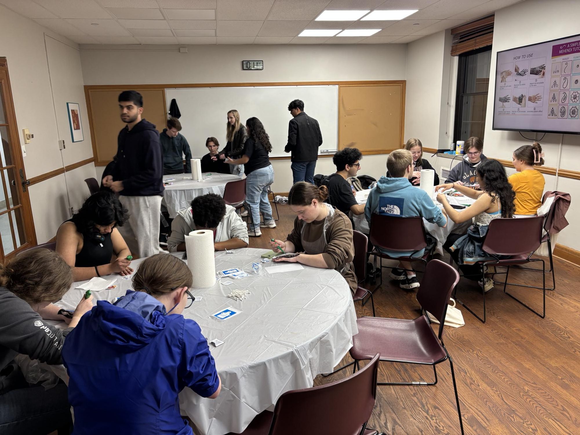 Participants began the evening with a brief presentation before receiving materials such as henna pens and stencils. After spending approximately ten minutes crafting their designs, students moved to a designated drying area, allowing their creations to set while preparations were made for the next group. Juventino Leyva Garcia, a first-year graduate student in the Student Affairs program and event committee director for the International Student Council, emphasized the event’s goal. “We provide henna stencils, and then we also provide some examples if they don’t want to follow the stencils,” Garcia explained. “They have 10 minutes to kind of create whatever piece of art they want.”