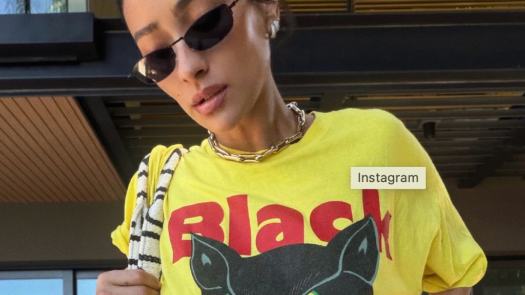 In a carousel of images shared on her Instagram account, Mitchell donned a striking bright yellow oversized “Black Cat” T-shirt. The relaxed fit of the tee provided a casual and effortless vibe, perfectly suited for a tropical getaway. Accompanying the tee, she sported slim sunglasses, elegant gold jewelry, and a woven tote, which enhanced the overall calm and confident aesthetic of her look.
